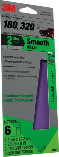 Our 3M™ Performance Sandpaper is a premium abrasive sheet that is built specifically for hand sanding on jobs such as shaping auto body filler or putty. These one-third (9” x 3”) sandpaper sheets feature fast-cutting, long-lasting aluminum oxide/ceramic blend abrasive on durable paper backing that attaches easily to sanding blocks. This sandpaper is ideal for use with the 3M™ Body Repair System.