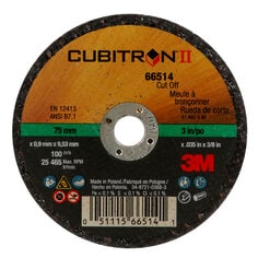 3Mâ„¢ Cubitronâ„¢ II cut-off wheels with precision-shaped grain are engineered to cut faster than competitive ceramic products, offering significant productivity gains. MUST BE USED WITH A WHEEL GUARD THAT FITS THE SIZE OF THE CUT-OFF WHEEL. Rigid, reinforced resin-bonded wheel slices through almost all materials including stainless steel, mild steel, and aerospace alloys. Triangular shaped ceramic grain wears evenly, runs cool, and optimizes mineral breakdown, for extra long life. Wheel must have a maximum operating speed greater than or equal to the maximum speed of the power tool used