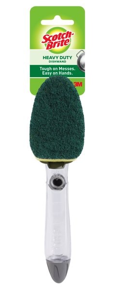 Powerful scrubbing for stuck-on messes. Safe on: Non-coated cookware, oven grates, concrete floors and more. Scotch-Brite dishwands are long lasting and reusable. Scraper helps remove stuck-on food. Scrubbing fibers are made from 100% recycled content. Store the dishwand upwards. Top shelf dishwasher safe and reuse. When it is time to change the head, hold the dishwand with head facing up. Push tab away from handle, slide refill off and push forward to remove. Slide new head onto handle and click into place. Leave Soap Stopper in place to slow soap flow. Works with all Scotch-Brite Refills