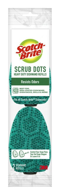 Antibacterial – Fights Odor Causing Bacteria. Dishwand head may vary. Fill it up with your favorite dish soap and effortlessly wipe away grease and grime. For Soap Control Dishwands, remove Soap Stopper by pushing up through back of new head to dispense soap through hole. Leave Soap Stopper in place for classic dishwands. Powerful scrubbing for stuck-on messes. Resists odors & rinses clean – even eggs and cheese won’t stick. Safe on: Non-coated cookware, oven grates, concrete floors and more. Scotch-Brite dishwands are long lasting and reusable. Scraper helps remove stuck-on food. This Scotch-Brite cleaning tool contains an antimicrobial agent in the scrubber pad that protects the product from bacterial odors. Product does not protect users or others from food-borne or disease-causing bacteria. Clean thoroughly after use. Top shelf dishwasher safe. When it is time to change the head, hold the dishwand with head facing up. Push tab away from handle, slide refill off and push forward to remove. Slide new head onto handle and click into place. Works with all Scotch-Brite Dishwands