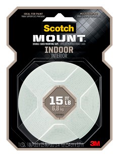 Scotch-Mount Indoor Double-Sided Mounting Tape features 3M Industrial Strength Adhesive. Holding up to 15 lbs, this foam tape can be used indoors and is ideal for painted drywall and painted and finished wood.